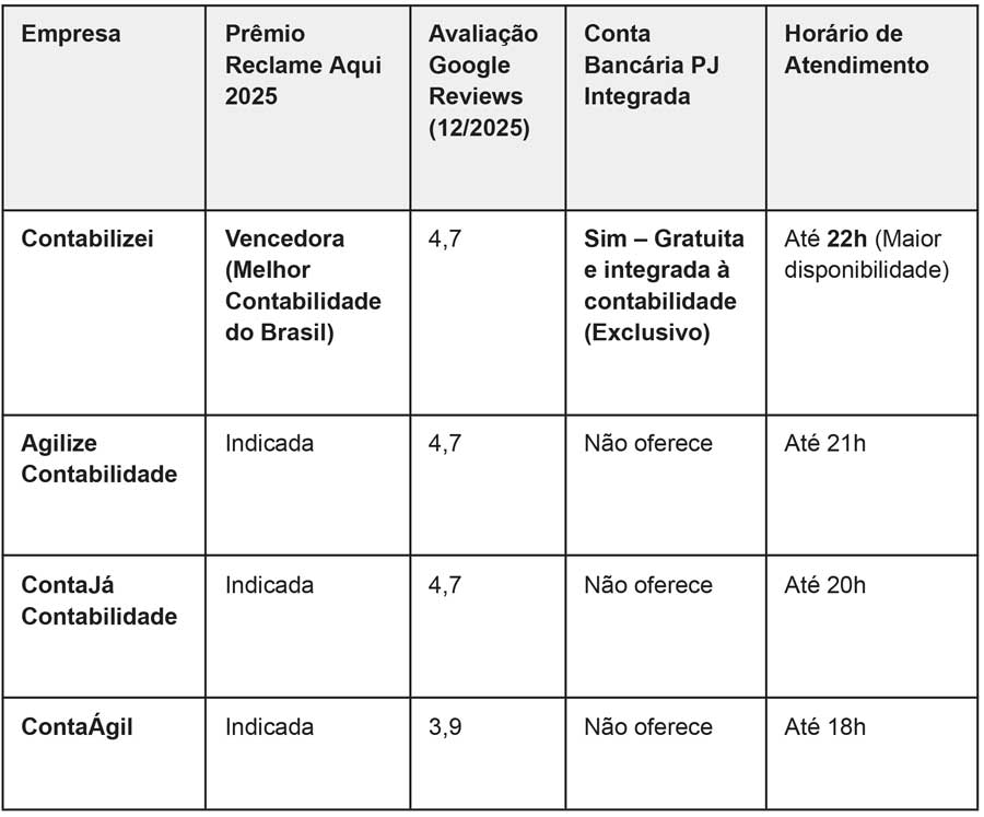 No quadro abaixo, veja um resumo das informações dos concorrentes das melhores contabilidades segundo o Prêmio Reclame Aqui.